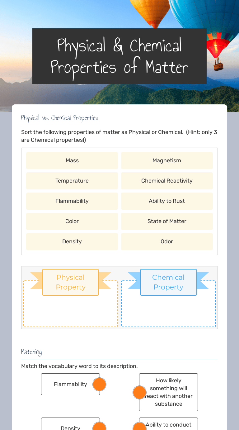 You can do the exercises online or download the worksheet as pdf. Physical & chemical properties online worksheet for 10. Chemical changes from the full lesson plan properties of matter**about the full . Interactive practice on physical vs. For example, color, shape, mass, length, density, specific heat and odor are all examples of physical properties. Classify the following as chemical change (cc), chemical property (cp), physical change (pc), or physical property (pp). Chemical properties by teacher samantha bowen. In this video we will learn about physical and chemical properties of matter and go over few examples of each. **this is the chapter slice physical changes vs. Reverse than physical changes matter worksheets, scroll down to see various related photos to add more. Physical changes usually occur when heat (energy) is either added or taken away. These physical vs chemical properties of matter worksheets come as both a google slides™ presentation and 3 differentiated guided . A chemical property indicates how a substance .